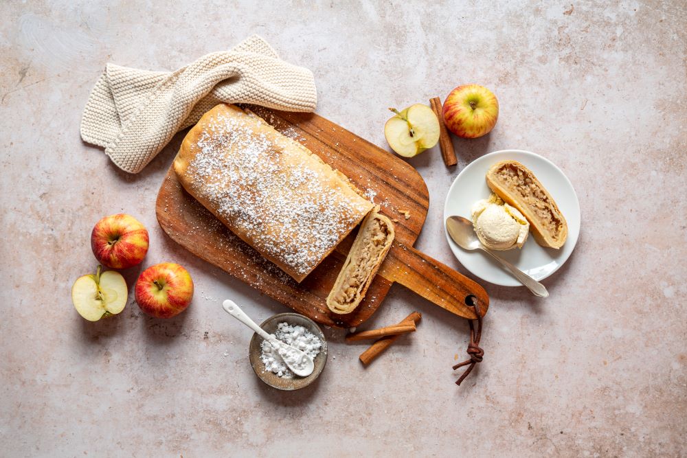 In der Mitte des vorgeheizten Backofens für ca. 40 Minuten backen. Wer mag kann den Apfelstrudel vor dem Servieren mit Puderzucker bestäuben.