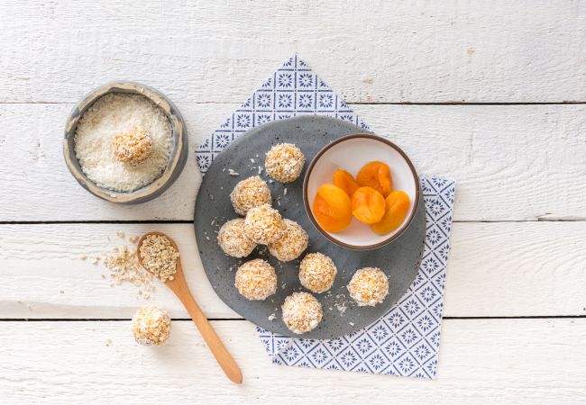 Die Hände ein wenig mit Wasser benetzen und aus der Masse kleine Kugeln formen. Die Bällchen in den Kokosraspeln wälzen. Sie halten sich 3 Tage bei Zimmertemperatur oder eine Woche im Kühlschrank.