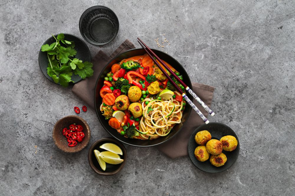 Asia-Zoodles mit Curry Kokos Falafel