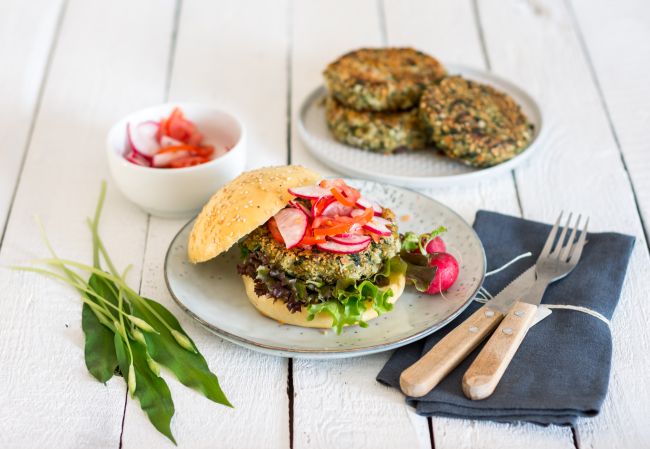 Den Bärlauch waschen und fein hacken. Die Gemüseburger nach Packungsanleitung zubereiten und den Bärlauch unterrühren.