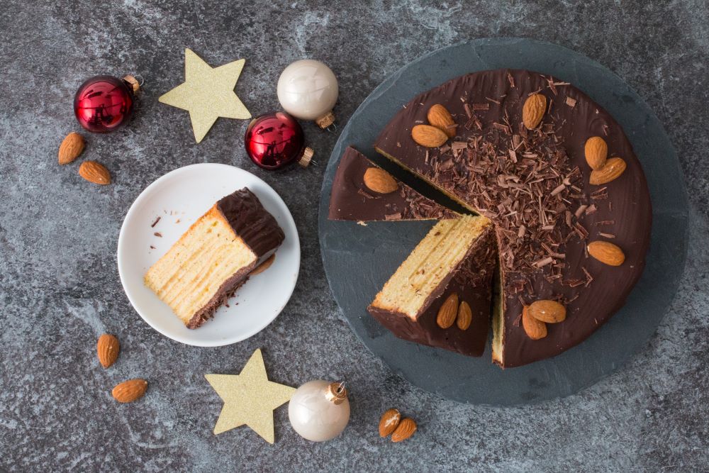 Den Baumkuchen auskühlen lassen und aus der Form nehmen. Dann mit der über einem Wasserbad geschmolzenen und mit dem neutralen Öl vermengten Kuvertüre bestreichen, mit Mandeln garnieren, trocknen lassen und genießen.