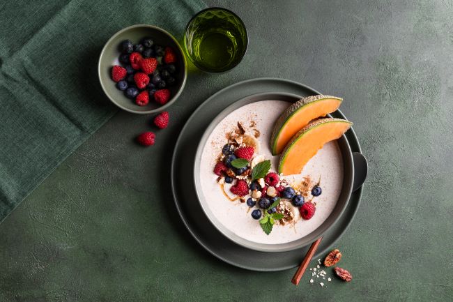 Vor dem Verzehr mit Galiamelone, Heidelbeeren, Himbeeren und restlicher Banane garnieren und servieren.
