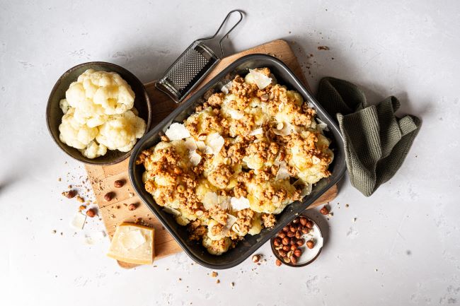 Den Blumenkohlauflauf für 15 Minuten im Ofen backen. Nach der Backzeit aus dem Ofen nehmen, nochmal mit etwas Parmesan bestreuen und direkt servieren.