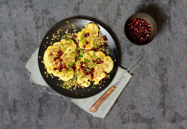 Den Blumenkohlsteaks aus dem Ofen nehmen und die Flocken, die Granatapfelkerne und die Petersilie darüber geben. Dazu passt ein leckerer Dip und Baguette oder Reis.