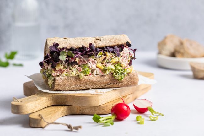 Die Baguettes halbieren und aufschneiden, großzügig mit der Chopped Salad Masse füllen. Mit Gemüsekresse bestreut servieren.