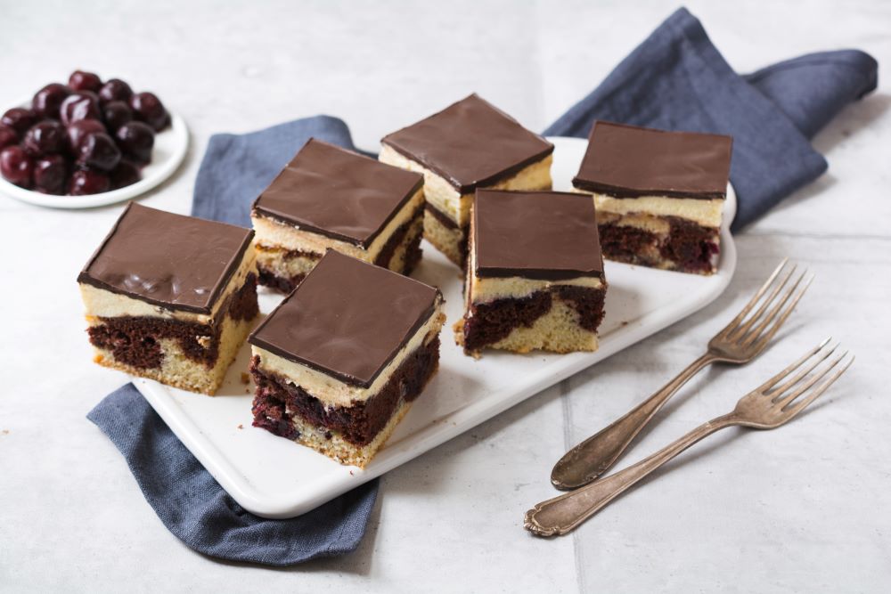 Den dunklen Teig vorsichtig auf dem hellen Teig verteilen. Kirschen abtropfen lassen, auf dem Teig verteilen und leicht andrücken.