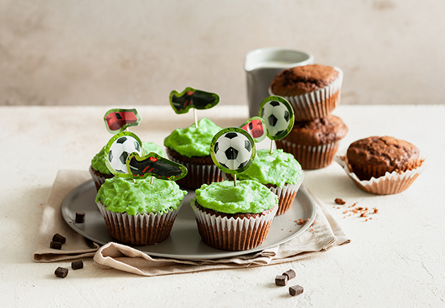 Muffins mit kleinen Fußballdekoelementen garnieren und servieren.