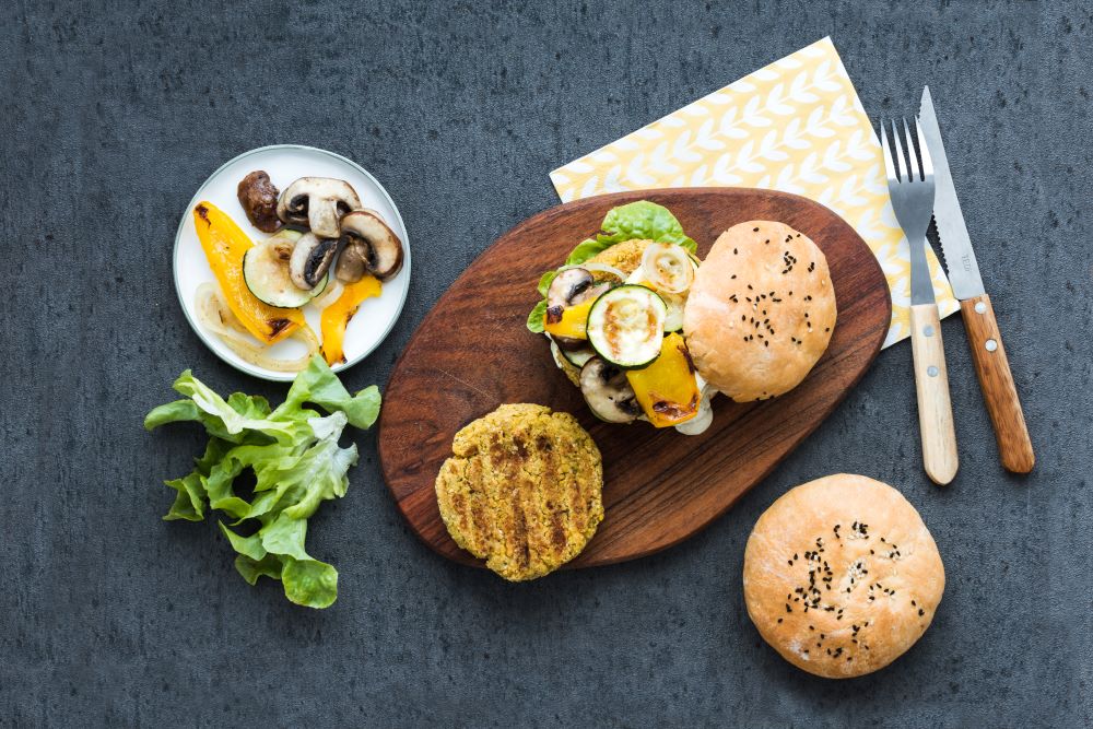 Das Gemüse und die Patties in einem Kontaktgrill oder auf einem Grill mit Aluschale anbraten. In der Zwischenzeit alle Zutaten für die Soße miteinander verrühren. Die Brötchen aufschneiden, mit der Soße bestreichen und etwas Salat daraufgeben.