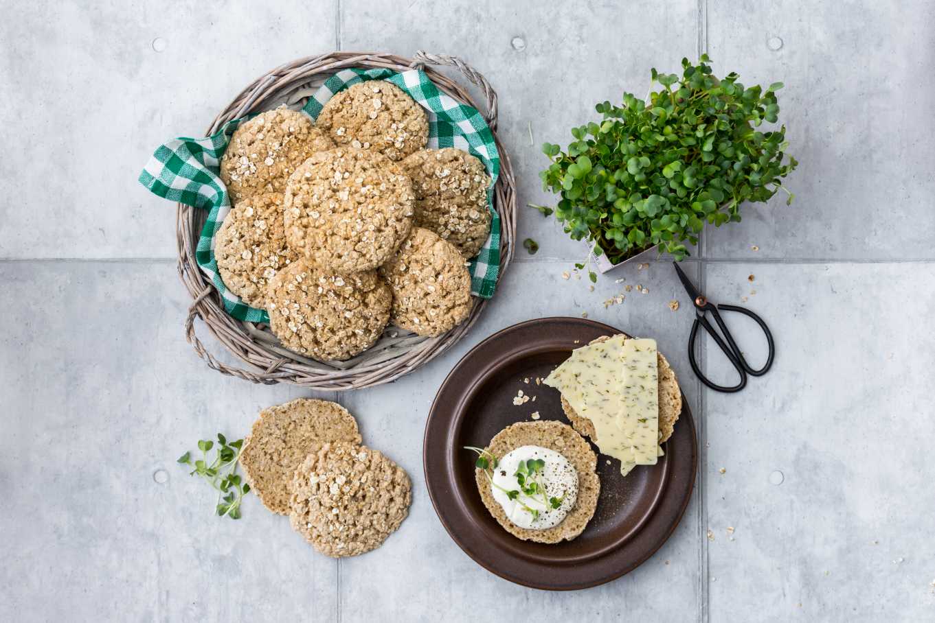 Die Teiglinge mit einem spitzen Messer mehrfach einsteichen und mit Wasser einpinseln. Mit Haferflocken bestreuen und für 20 Minuten abgedeckt an einem warmen Ort gehen lassen.