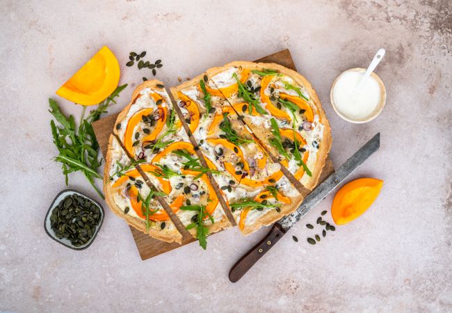 Den fertig ausgerollten Teig mit dem Backpapier auf ein Backblech ziehen und mit Schmand bestreichen. Alles mit Salz und Pfeffer würzen. Kürbis, Schalotte und Kürbiskerne darauf verteilen.