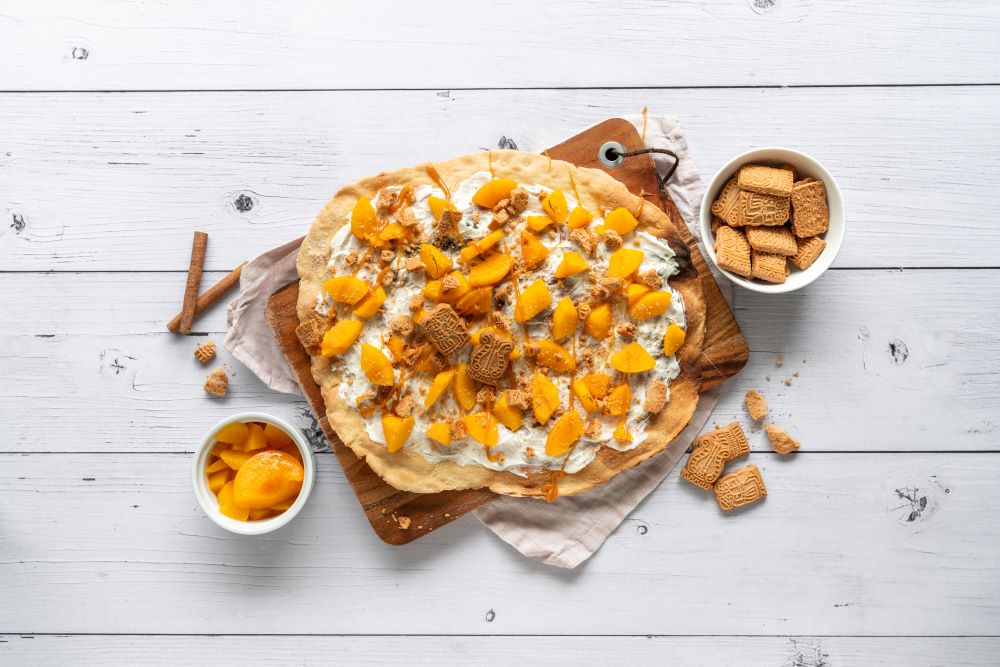 Flammkuchen mit Pfirsich und Spekulatius-Brösel