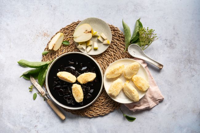 Die Suppe auf Teller verteilen, Nocken hinzugeben und mit etwas Zimt/Zucker bestreuen.