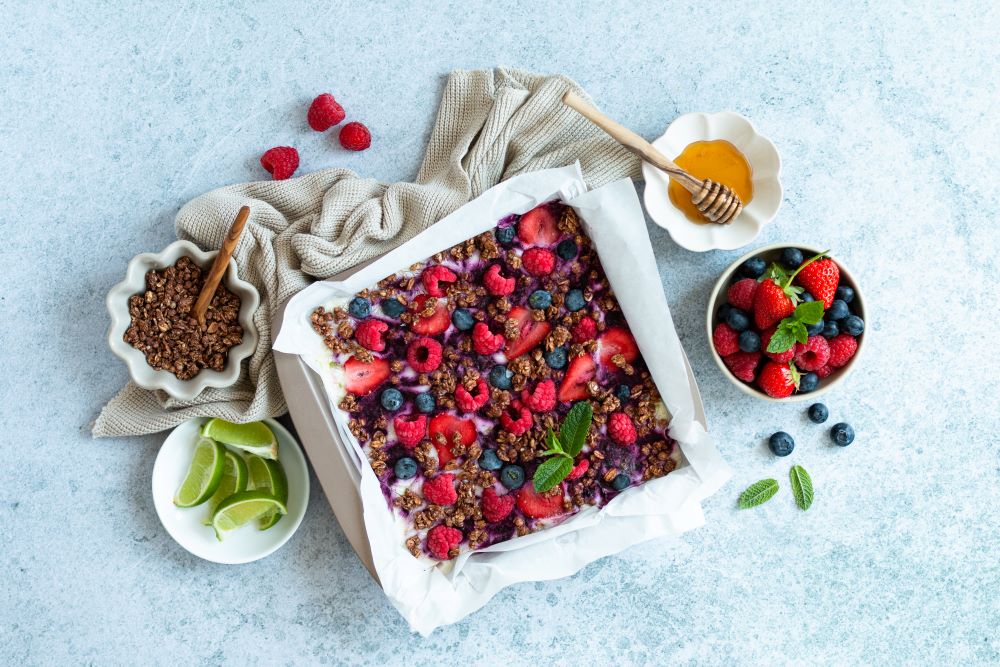 Nun die gestückelten Erdbeeren, Himbeeren und Heidelbeeren sowie das Hafer Crunchy Schoko auf der Joghurtmasse verteilen. Die Form ins Gefrierfach stellen und mind. 6 Stunden oder über Nacht festwerden lassen.