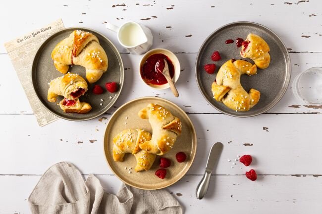 Teig nach der Gehzeit auf einer leicht bemehlten Arbeitsfläche rund ausrollen, dann wie eine Pizza in 8 Dreiecke schneiden. Jeweils außen 1 TL Himbeer-Konfitüre auf den Teig streichen und von der breiten Seite her zu Hörnchen aufrollen.