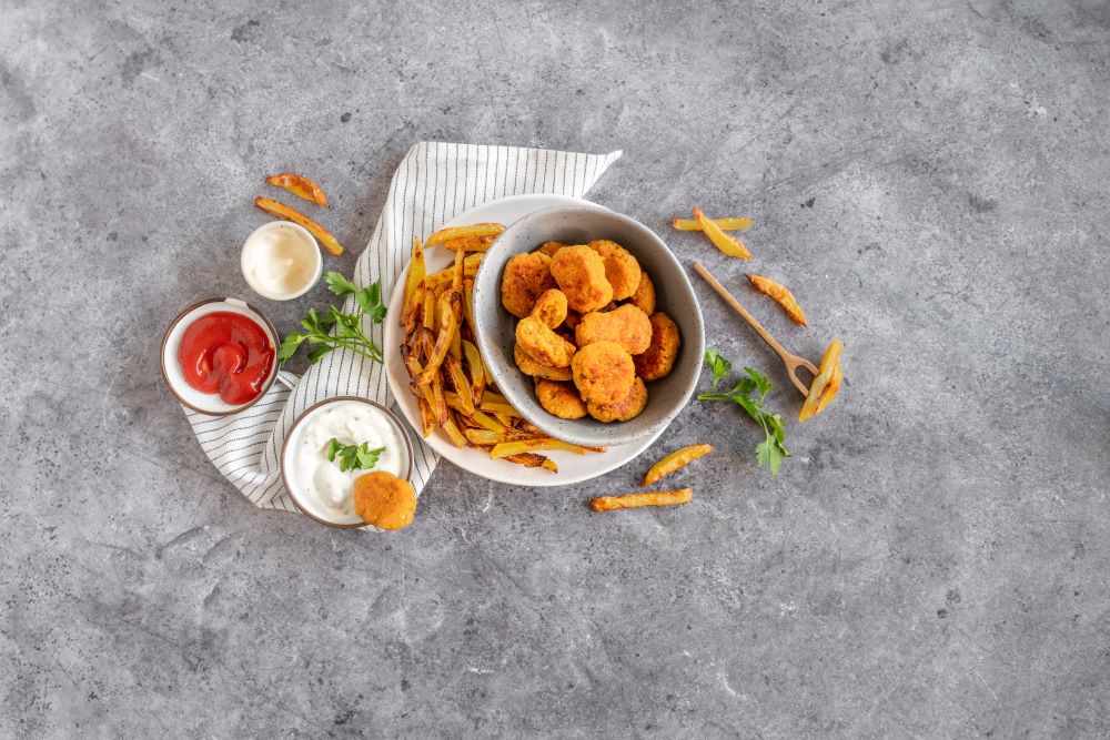 In der Zwischenzeit die Nuggets nach Packungsanleitung zubereiten und in reichlich Öl von beiden Seiten anbraten.