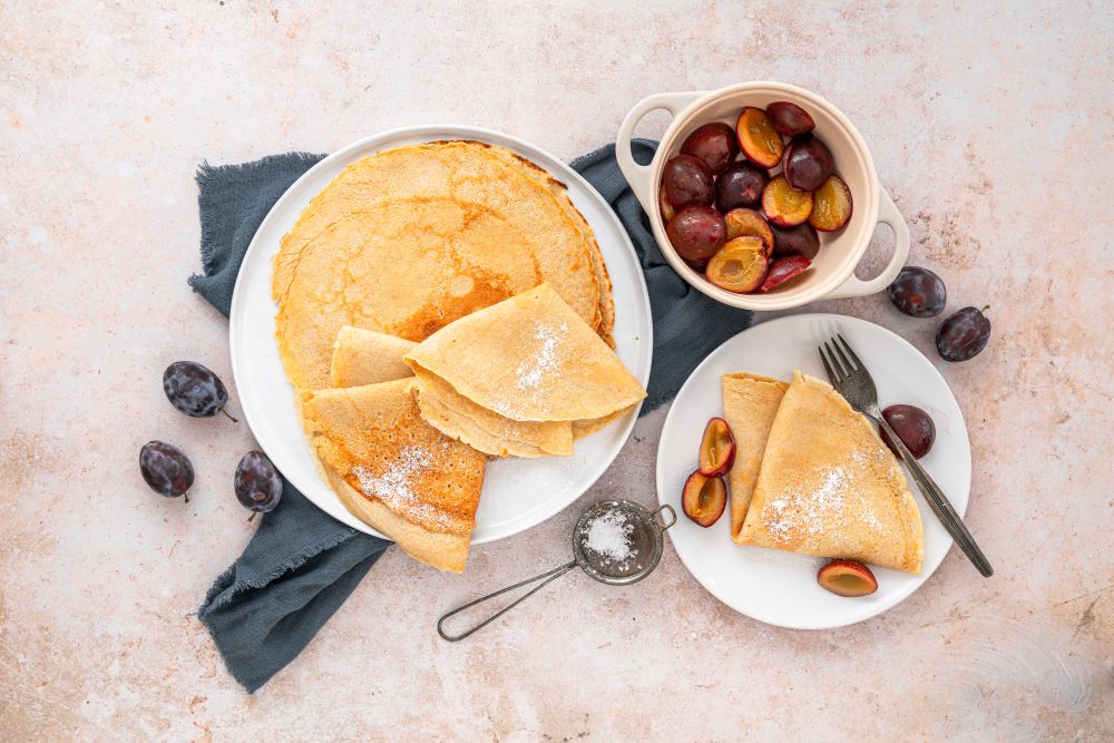 Den Crêpe von beiden Seiten goldgelb backen. Mit dem restlichen Teig weiter verfahren. Die Zwetschgen halbieren und entkernen. Das Obst zusammen mit dem Wasser, Zucker und Zimt in eine Pfanne geben und etwas 10min dünsten, bis die Zwetschgen weich sind.