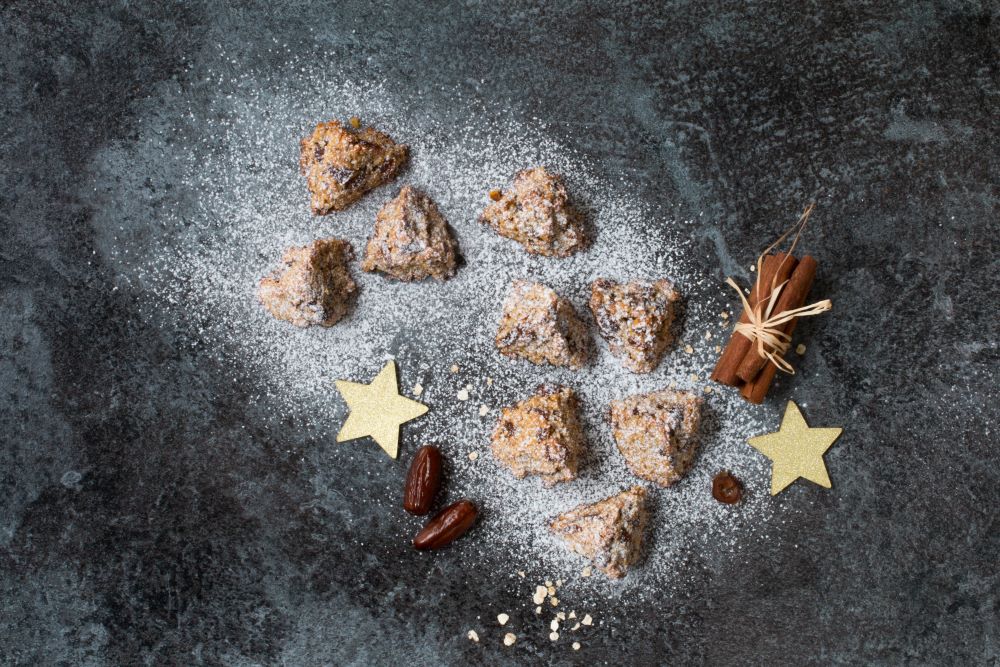 Mit zwei Teelöffeln kleine Berge auf das Backpapier setzen, mit feuchten Händen leicht festdrücken und im vorgeheizten Ofen bei 175 °C Ober- und Unterhitze für 15-20 Minuten backen. Die fertigen Dattel-Dünen mit Puderzucker bestäuben und genießen.