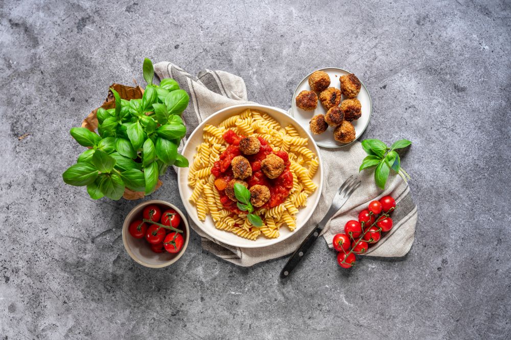 Die fertigen Bällchen mit der Soße und Nudeln oder Brot servieren.