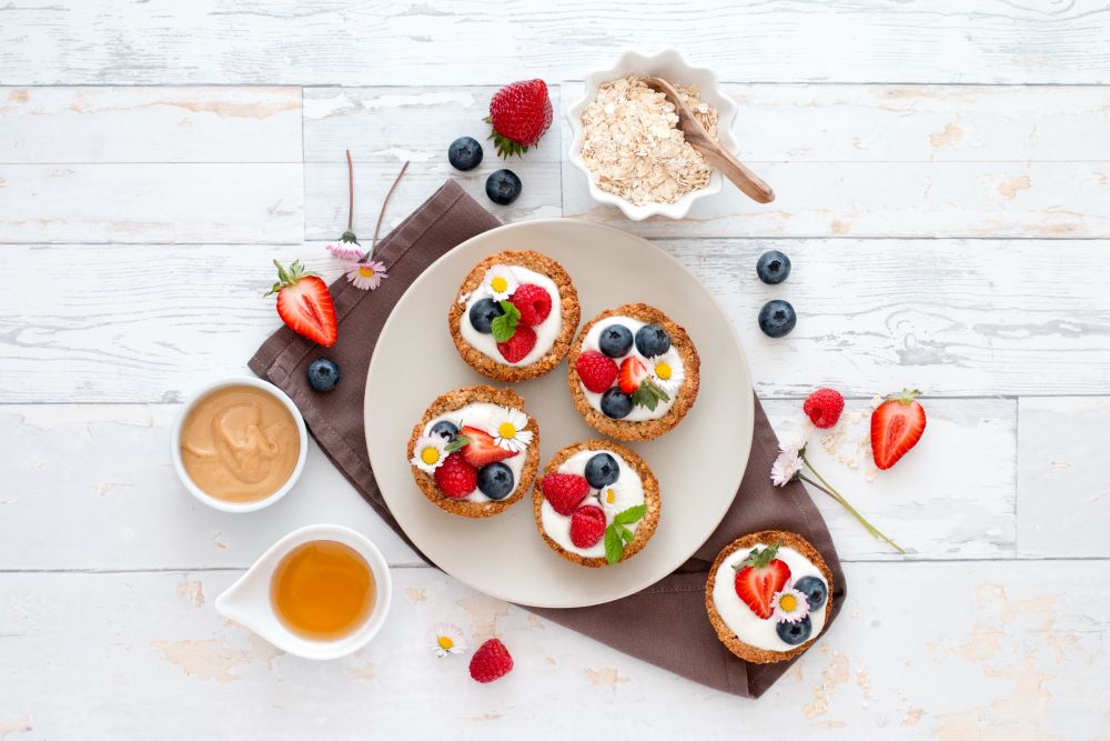 Statt Beeren schmeckt auch Ananas oder Mango mit Kokoschips als Belag auf den Haferflocken-Nestern. Sie können zum Frühstück oder auch als kleines Dessert serviert werden.