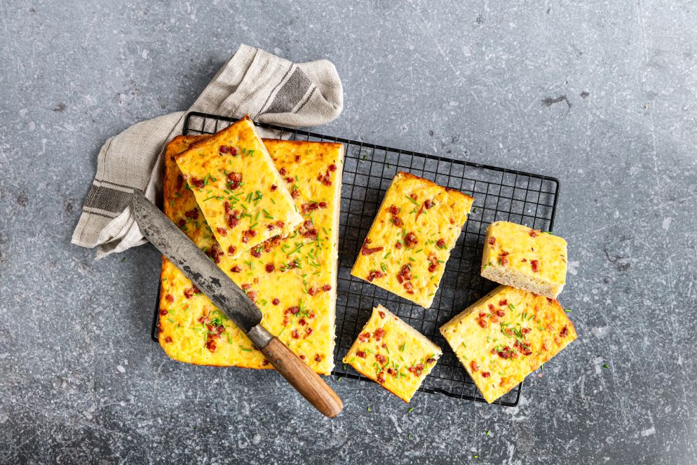 Tipp: Der herzhafte Kuchen schmeckt auch kalt, zum Beispiel als kleine Happen auf einem Buffet.