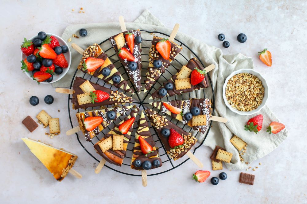 Die Kuchenstücke nun ganz oder teilweise mit der geschmolzenen Kuvertüre bedecken. Sofort mit gehackten Mandeln, Erdbeeren, Heidelbeeren und Mini-Butterkeksen dekorieren und erkalten lassen. Nun kann der Käsekuchen wie ein Eis am Stiel gegessen werden.