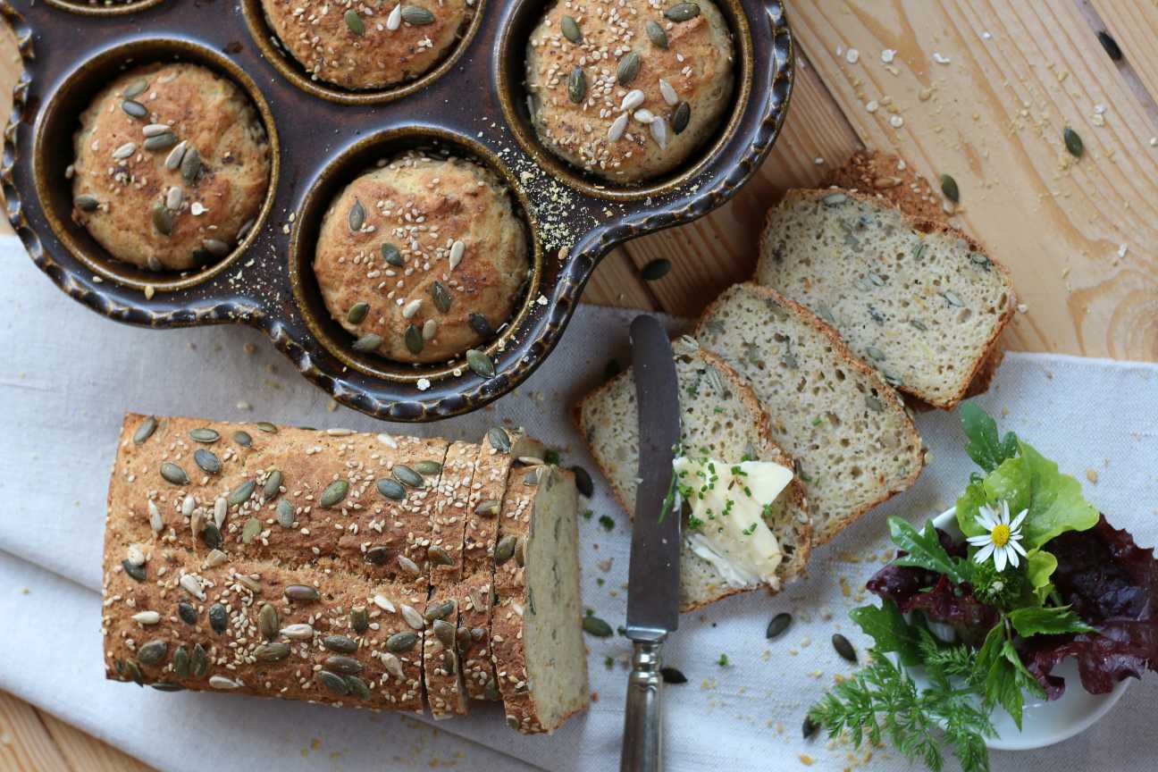 • Für 7 Brötchen: Teig in gefettete Muffinformen geben, etwas glatt streichen und mit Körnern bestreuen. 20 Minuten ruhen lassen, dann ca. 25 Minuten backen.