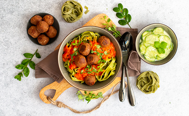 Zeitgleich zum Nudeln kochen, die Köttbullar im restlichen Rapsöl (2 EL) in einer Pfanne bei mittlerer Hitze von allen Seiten kräftig anbraten und mit den Bandnudeln und der cremigen Tomatensauce servieren. Dazu den Gurkensalat reichen.