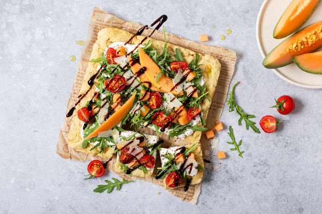 Melone und Tomaten klein schneiden. Die ausgekühlte Foccacia mit Ziegenfrischkäse bestreichen, mit Rucola, Cantaloupe-Melone, Tomatenstücken und Parmesanspilttern belegen. Vor dem Servieren mit Balsamicocreme, Salz und Pfeffer garnieren und servieren.