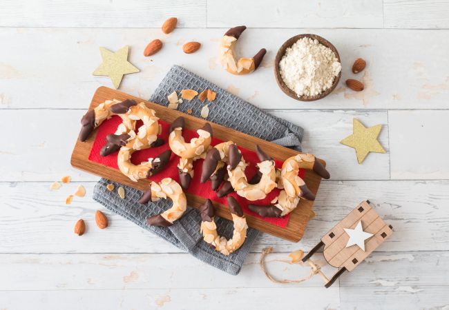 Schokolade schmelzen, die Ecken der Mandelhörnchen darin eintauchen, aushärten lassen und genießen.