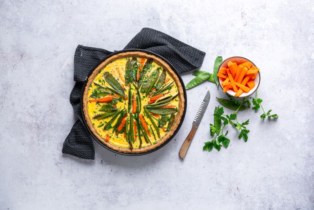 Die Quiche kann auch in einer veganen Variante zubereitet werden. Dafür die Butter durch eine pflanzliche Margarine ersetzen. Für die Füllung 150g veganer Joghurt mit 350ml Hafermilch und 40g Speisestärke verrühren.
