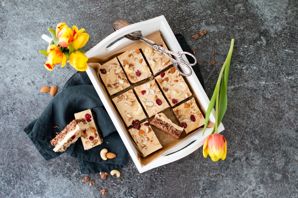 Die Masse in eine mit Backpapier ausgelegte Brownieform (ca. 20 x 30 cm) geben und gleichmäßig festdrücken. An einem kühlen Ort ca. 10 Minuten ruhen lassen.