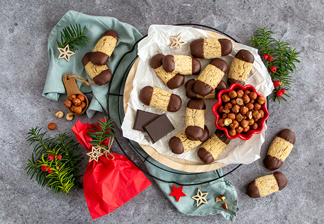 Die Nussstangen auf ein mit Backpapier ausgelegtes Blech setzen und etwa 10-12 Minuten backen, bis die Ränder ganz leicht gebräunt sind.