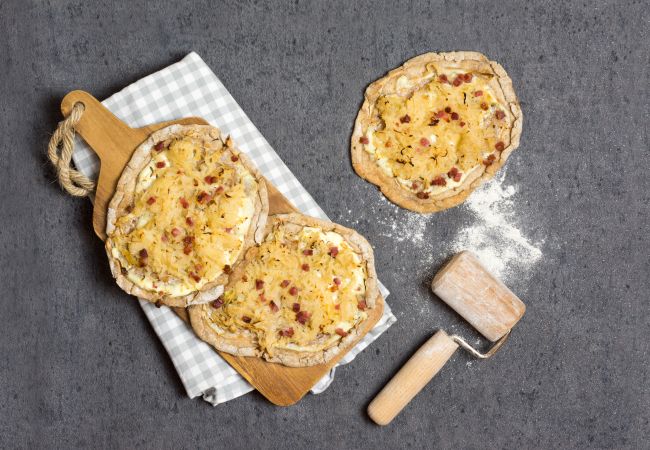 Das Ganze mit Kümmel, Salz und Pfeffer würzen. Das Sauerkraut und den Schinken auf dem Schmand verteilen. Die Fladen für etwa 20min im Ofen backen.