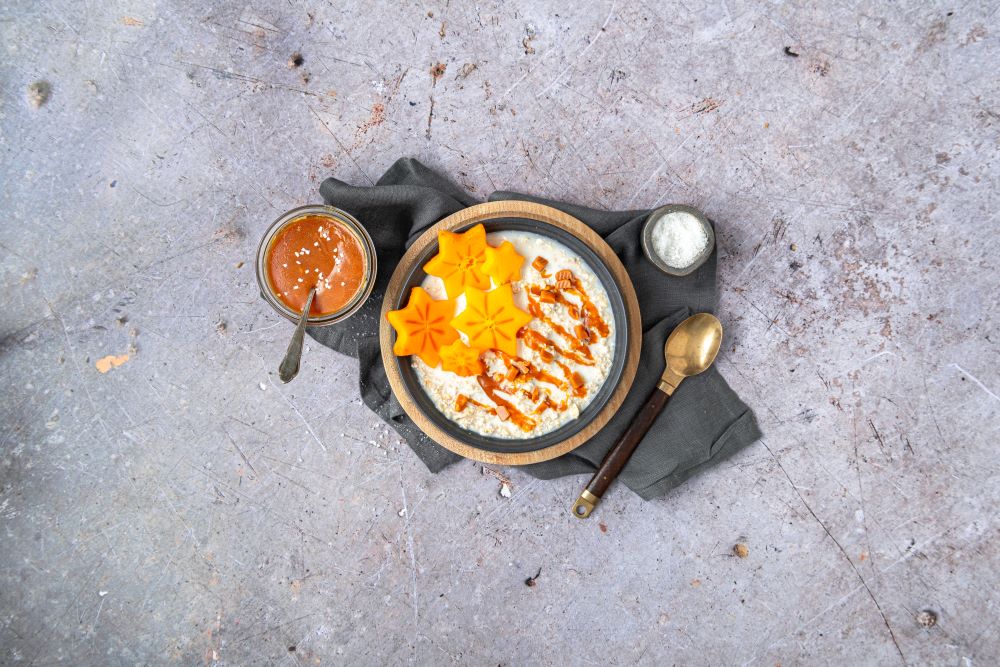Am nächsten Morgen etwas Karamell über die Overnight Oats geben und mit frischem Obst servieren.
