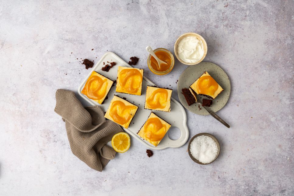 Die Brownies für ca. 40min backen. Danach etwas auskühlen lassen und das fertige Salzkaramell auf der Cheesecake-Schicht verstreichen.