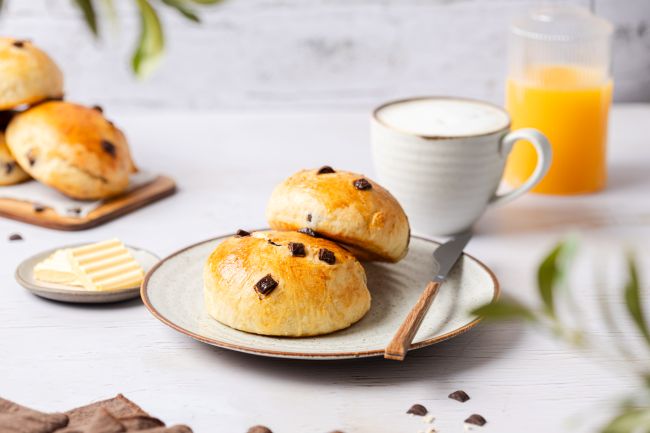 Statt Schokotropfen können auch Rosinen verwendet werden, um leckere Rosinenbrötchen zu backen.