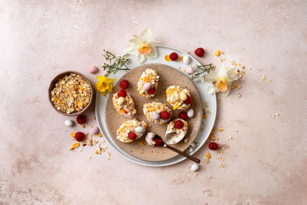 Die Schokohälfte mit dem Quark kuppelartig befüllen. Alles mit reichlich Knusper Müsli bestreuen und mit einer Himbeere dekorieren. Die Schokoeier zügig servieren.