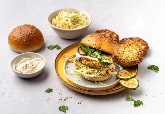 Untere Brötchenhälfte mit Dip bestreichen, Salat oder Coleslaw draufgeben, Patty auflegen und nach Wunsch mit Gemüse toppen.