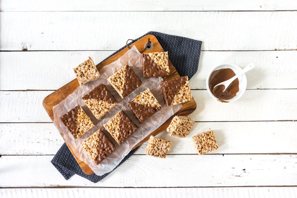 Die Haferpop-Krispies in kleine Quadrate schneiden. Die Schokolade im Wasserbad oder in der Mikrowelle schmelzen und die Krispies nach Belieben damit verzieren.