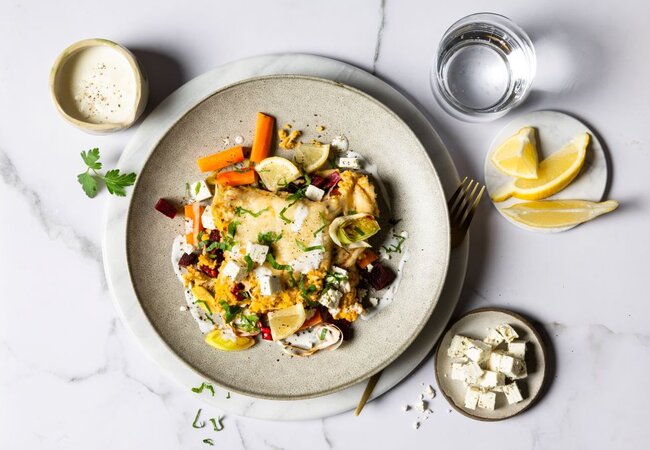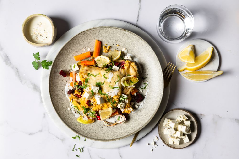 Rote Bete schälen und in Würfel schneiden. Karotten schälen und in Sticks schneiden. Lauch in Ringe schneiden. Feta würfeln. Das vorbereitete Gemüse in eine Auflaufform oder auf ein mit Backpapier ausgelegtes Blech geben. Mit Feta bestreuen und mit der Couscousmasse bedecken. Mit geriebenem Käse bestreuen und im Ofen ca. 30 Minuten backen.