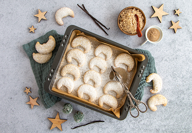 Den Teig für die Vanillekipferl zu einer gleichmäßigen Teigrolle formen und in gleichgroße Stücke teilen. Aus den Teigstücken zuerst Kugeln formen und diese anschließend durch Rollen zwischen den Handinnenflächen in die typische Kipferlform rollen.