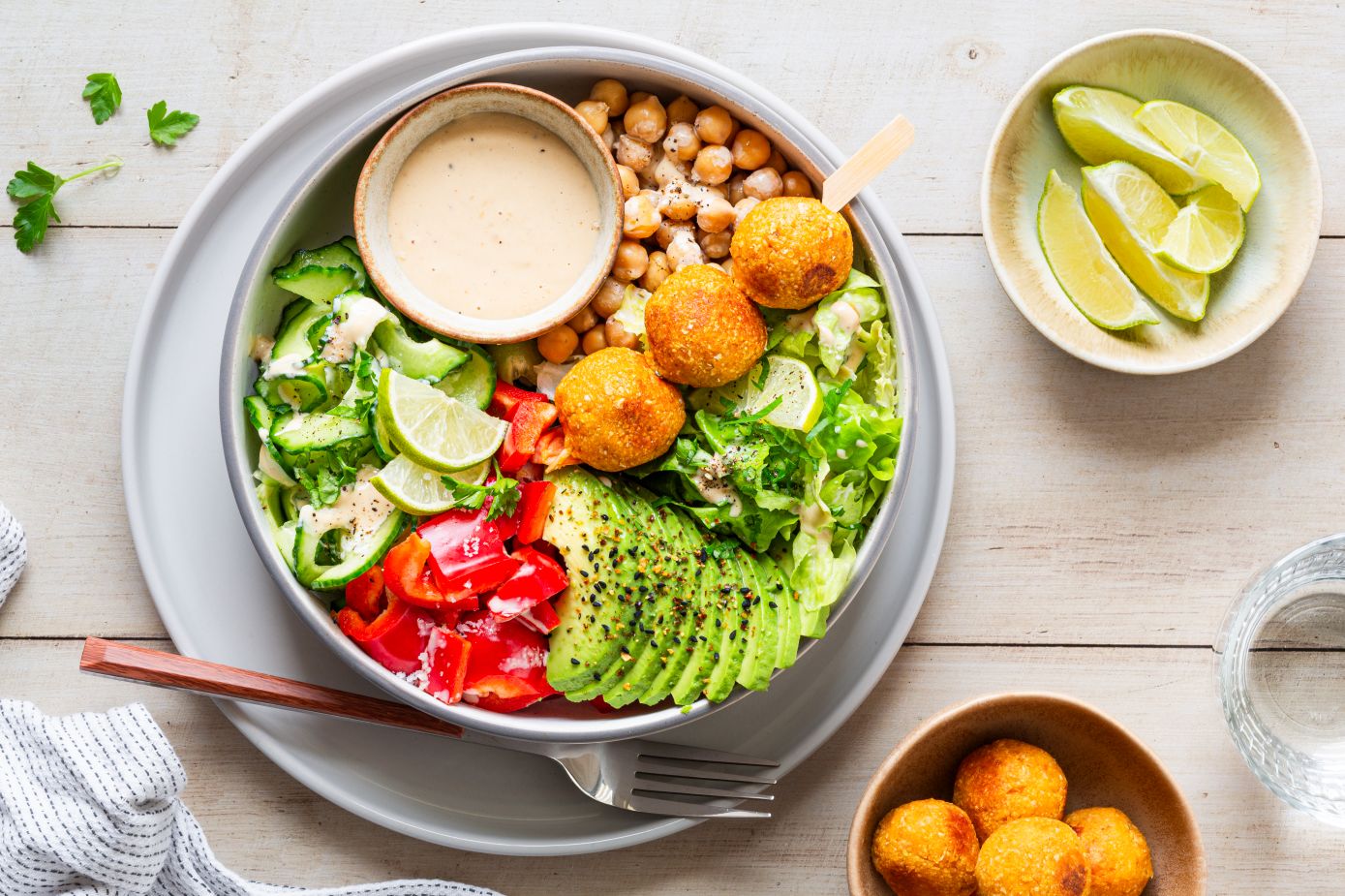Vegane Süßkartoffel-Falafel-Bowl mit buntem Gemüse
