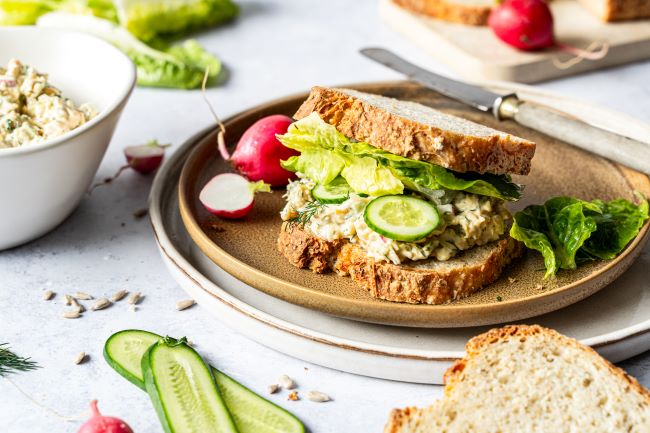 Das Brot in Scheiben schneiden, mit reichlich Kichererbsencreme bestreichen und mit Salat, sowie Gurkenscheiben toppen.