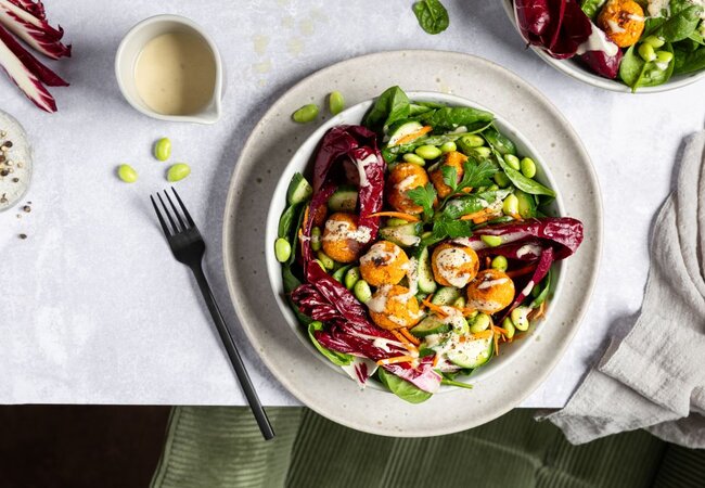 Die Süßkartoffel-Falafel in einer Pfanne in etwas Olivenöl von allen Seiten knusprig braten. Chicorée, Babyspinat, Edamame, Gurkenscheiben und Karottenraspel auf Teller verteilen, die Süßkartoffel-Falafel dazugeben, großzügig mit Zitronen-Tahinidressing beträufeln und genießen.