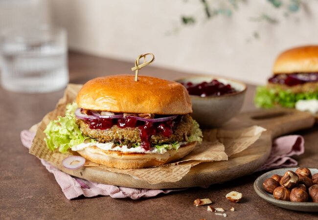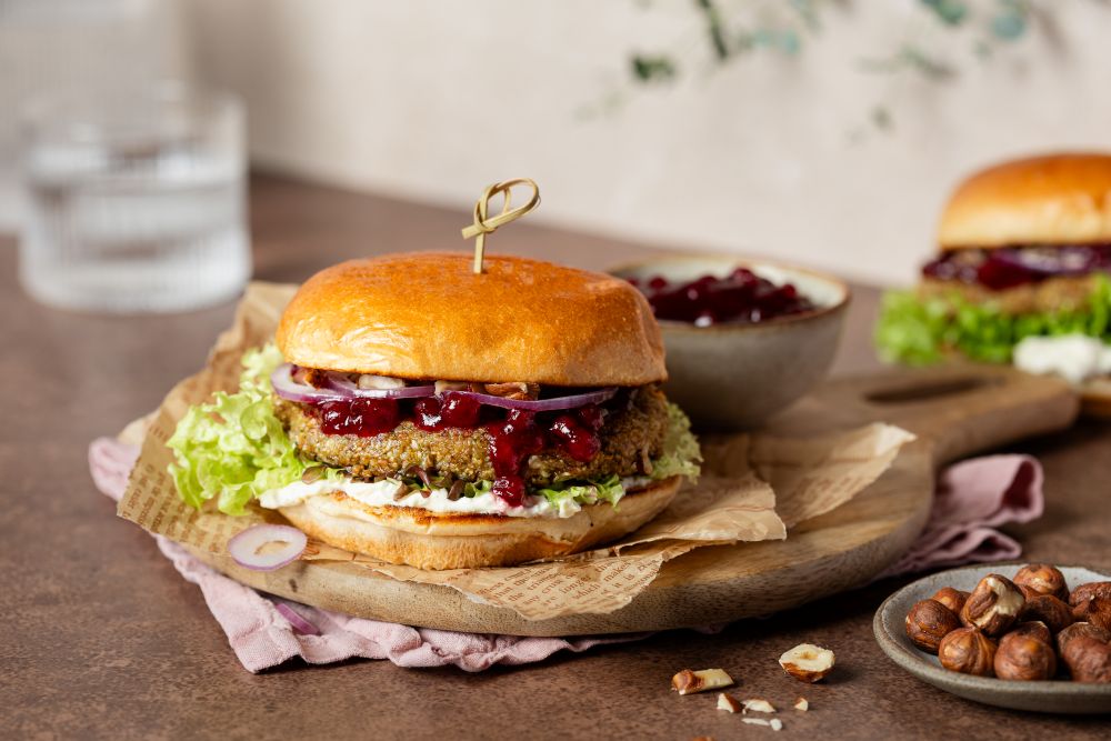 Burgerpatties in einer Pfanne in etwas Öl von beiden Seiten knusprig anbraten. Mit der Mascarponecreme bestreichen, dann mit Salat und den Dinkel-Nuss-Burgerpatties anrichten. Mit Preiselbeeren, gehackten Haselnüssen und Zwiebelringen garniert servieren.