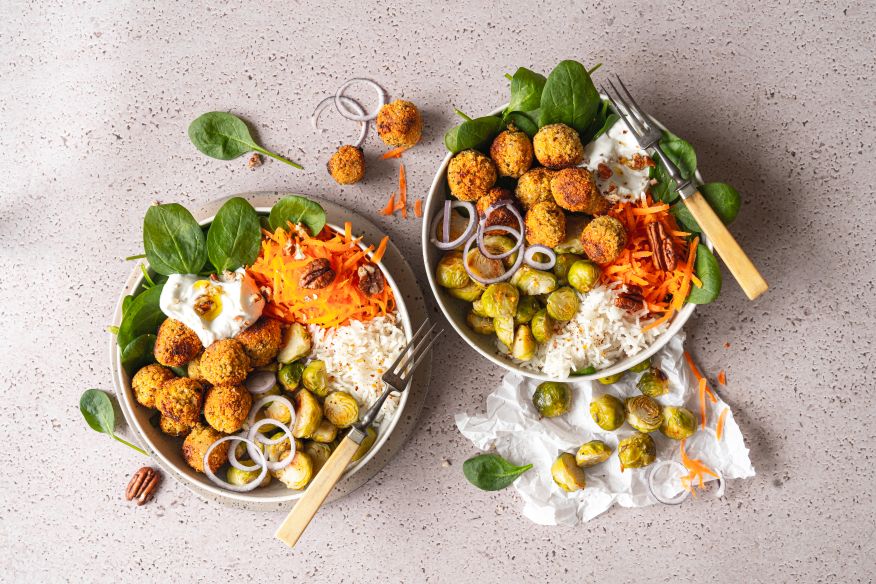 Winterliche Falafel Bowl mit geröstetem Rosenkohl