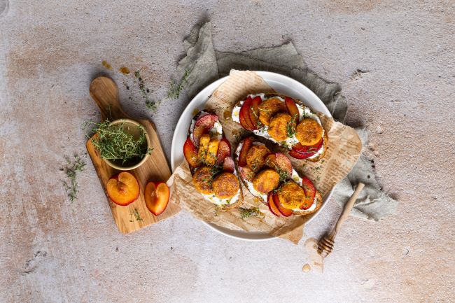 Die fertigen Süßkartoffel-Falafel und die marinierten Pflaumen auf die Frischkäsebrote geben und genießen.