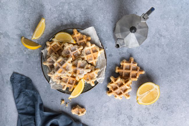 Das Waffeleisen vorheizen, dünn mit Öl bestreichen und jeweils ein Teigstück ins Waffeleisen geben. Teig backen, bis die Zitronen-Waffelkekse knusprig sind. Mit dem restlichen Teig ebenso verfahren.